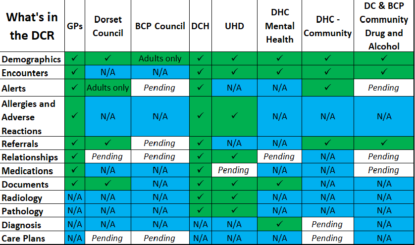 The data available in the DCR includes: Demographics (with data first from PDS/NHS Spine and then any extra from Partners), Encounters, Alerts, Allergies and Adverse Reactions, Referrals, Relationships, Medications, Correspondence, Radiology, Pathology, Care Plans.