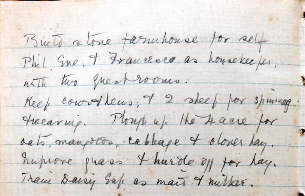 ‘Build stone farmhouse for self, Phil, Eve, & Francesca as housekeeper, with two guestrooms.’