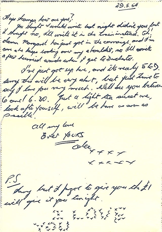 Hiya Scamps, how are you? You thought I would write last night didn’t you, but I thought no, I’ll write it in the train instead. Oh damn, Margaret has just got in the carriage and I’m sure she keeps looking over my shoulder, so, I’ll write a few hurried lines when I get to Dorchester.
