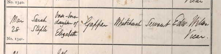 Does the incumbent at Whitchurch Canonicorum know that Elizabeth’s first marriage was to Robert Turner and that James Staple is not her true husband? No father’s name is given as such – was James Staple away working as a mason? Or was he avoiding the awkwardness of attending the baptism and providing his details for the register?