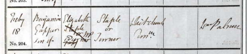 However, by 1851 Elizabeth had remarried, to James Staple, probable father of baby Sarah. When Sarah herself marries, in 1865, at the age of 25, she gives her name as Sarah Staple Gapper, and names James Staple as her father. As James was a Mason, its possible that his work moved him from place to place and that back in 1841 he had left Elizabeth and baby Sarah behind – leading her to marry Robert Turner the following year.