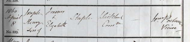 In April 1860 James and Elizabeth were blessed with another son, Joseph Henry. At this baptism both parents were named – James and Elizabeth Staple – and no additional remarks!
