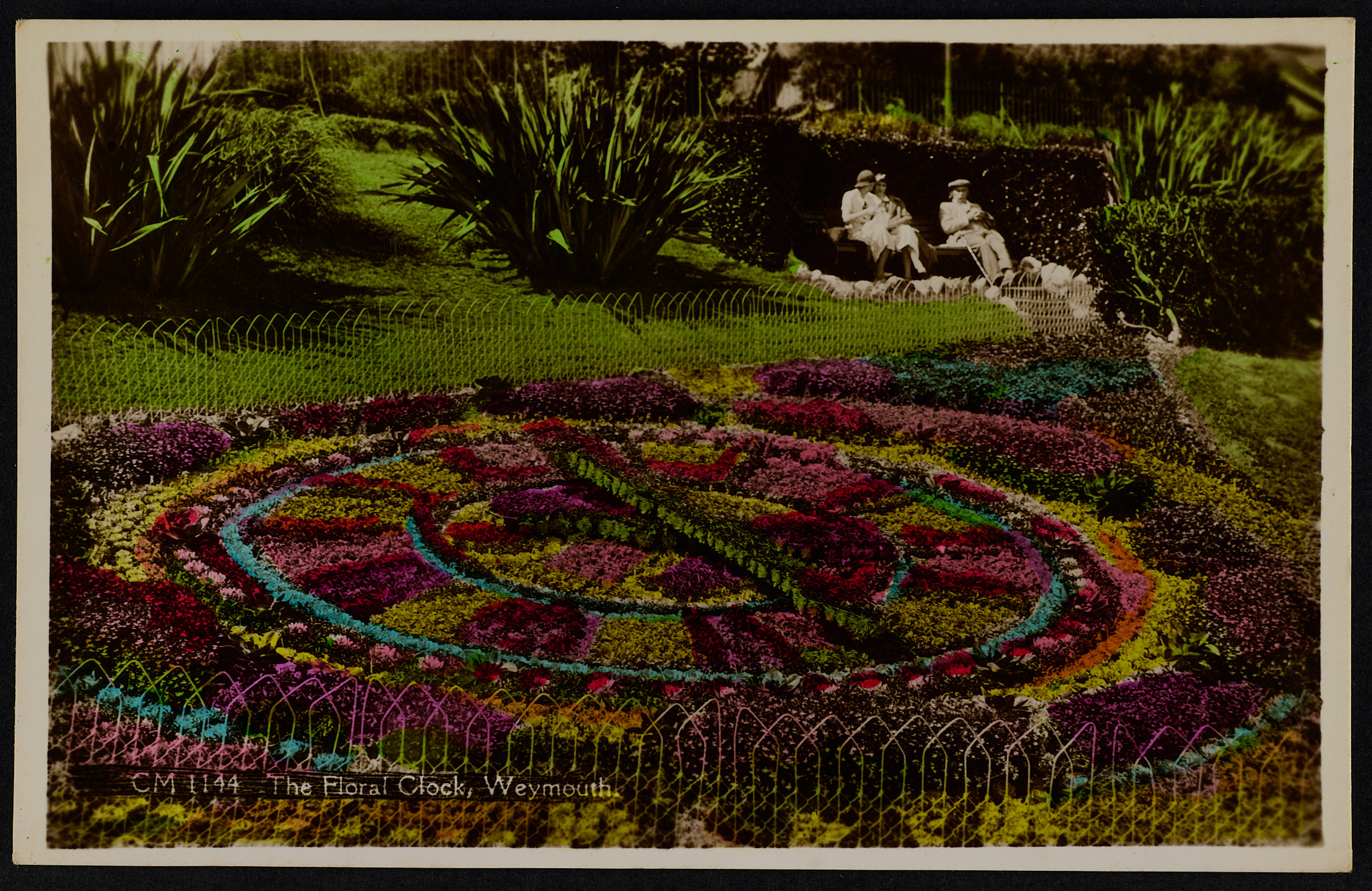 D-DPC/WY/48 – Finally, this postcard shows Weymouth’s floral clock, installed in 1936. It sits in Greenhill Gardens, which were opened in 1872 by Sir Frederic Johnstone, whose family had long represented Weymouth in Parliament. The gardens were presented to the town in 1902.