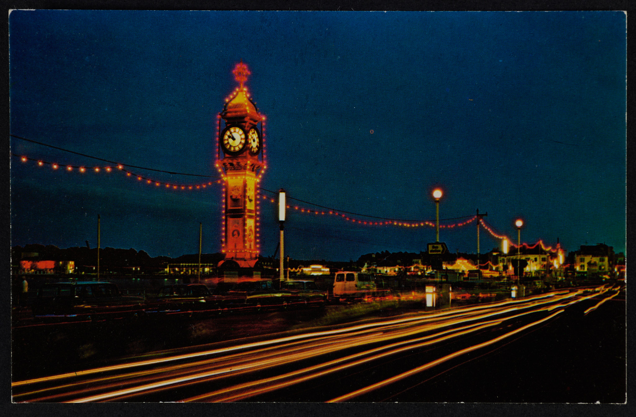 D-DPC/WY/62 – One of the most recognisable features of Weymouth’s esplanade is of course the Jubilee Clock. This structure was unveiled on 31st October 1888 and was intended to commemorate Queen Victoria’s Golden Jubilee. Seen in this postcard illuminated by colourful lighting, it was actually rather drab in its early days – it wasn’t until the 1920s that it was first painted in bright colours.