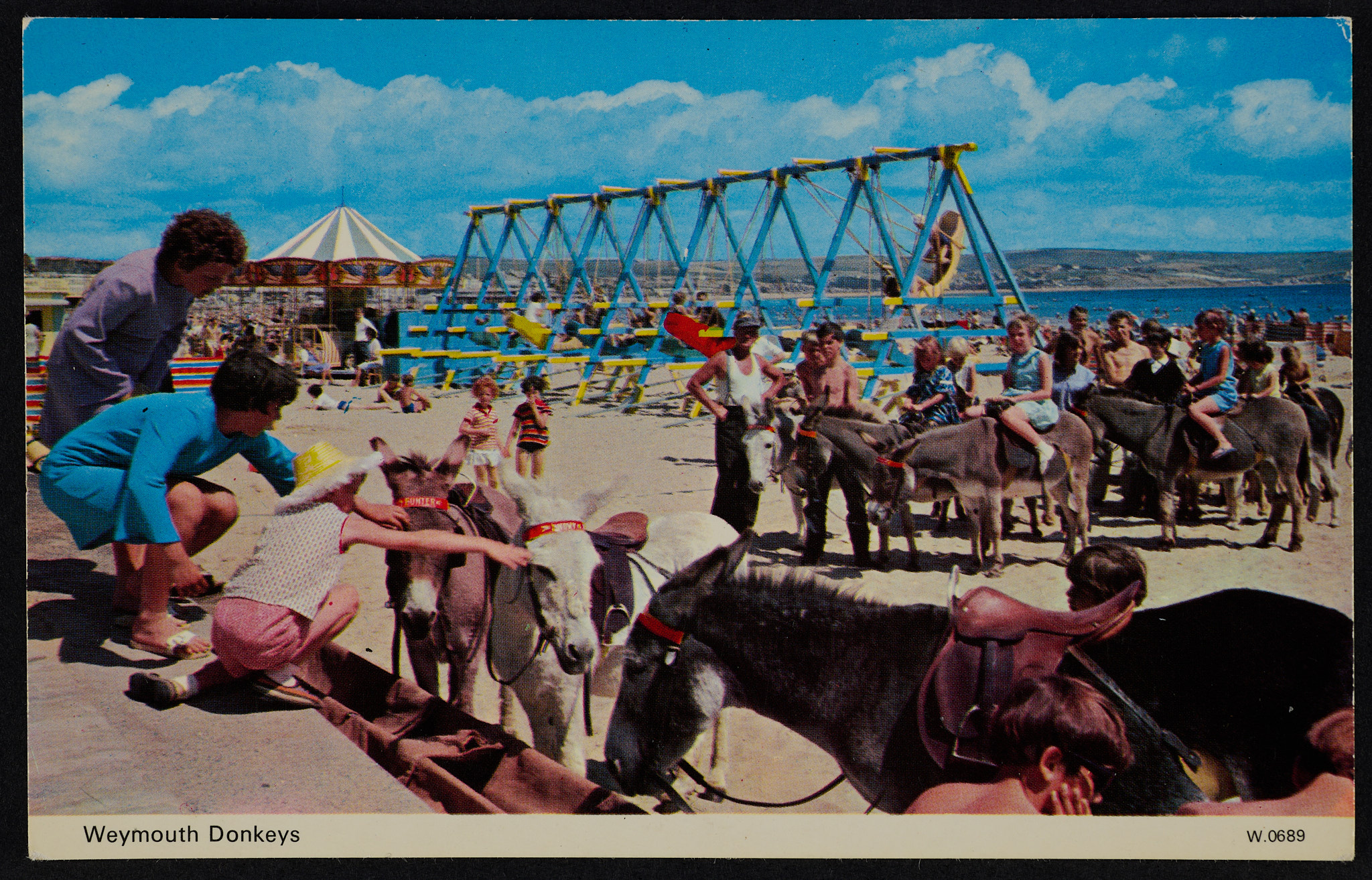 D-DPC/WY/64 – This colourful late 20th century postcard really needs no explanation. It shows the donkeys and swing boats on Weymouth beach, still popular attractions for tourists today!