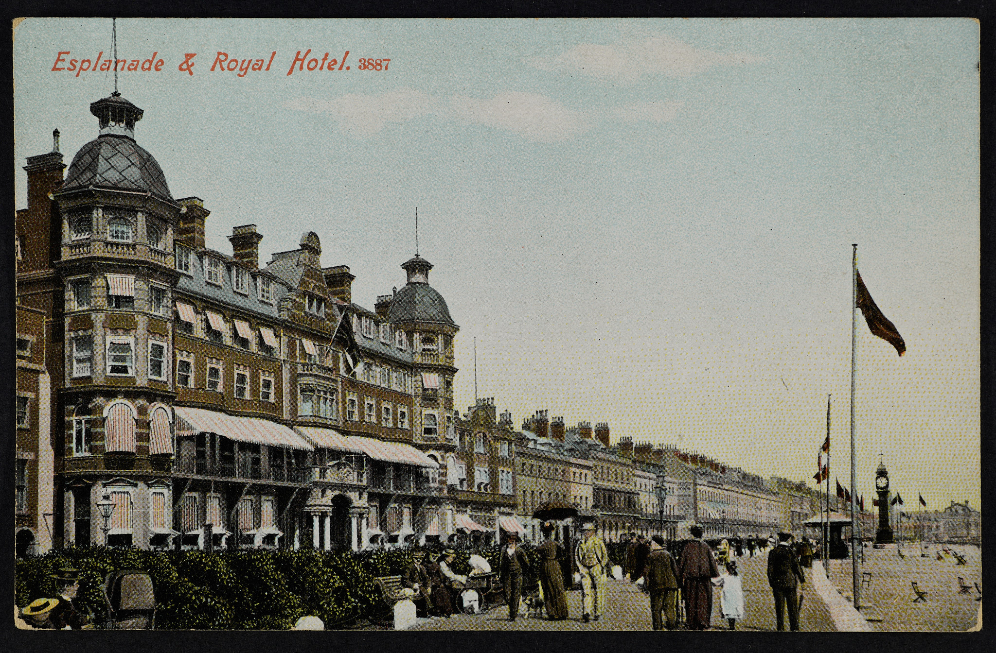 D-DPC/WY/67 – The original Royal Hotel was built in the early 1770s by a developer from Bath. It operated for over 100 years before being demolished in 1891, when the Weymouth Corporation decided that the bow-fronted Georgian building was out of date. The new Royal Hotel, shown in this postcard, opened in 1899.