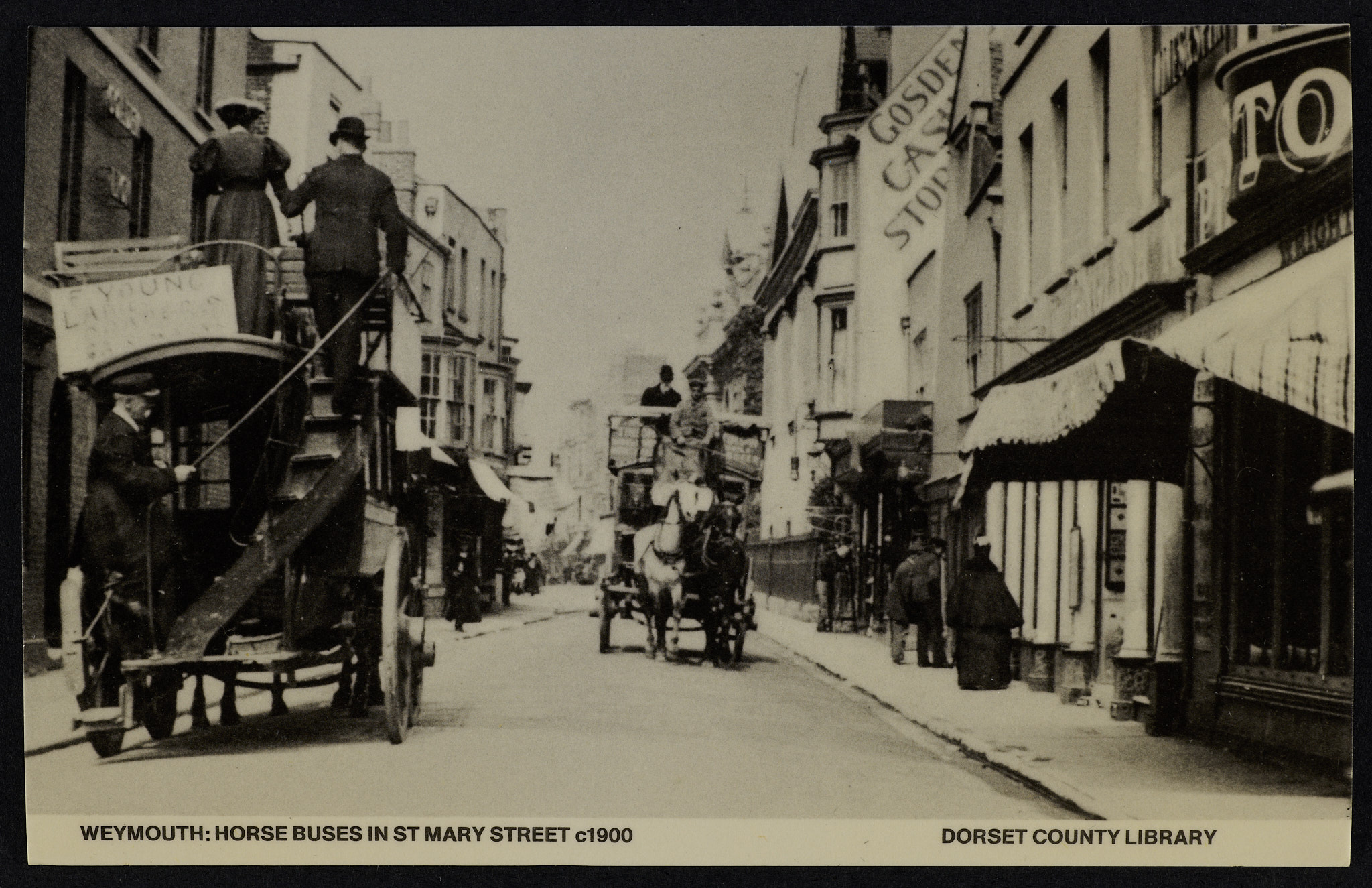 D-DPC/WY/10 and 78 – These next two postcards show examples of some of the modes of transport visitors to Weymouth might have used in the early 20th century – horse-drawn buses and charabancs.