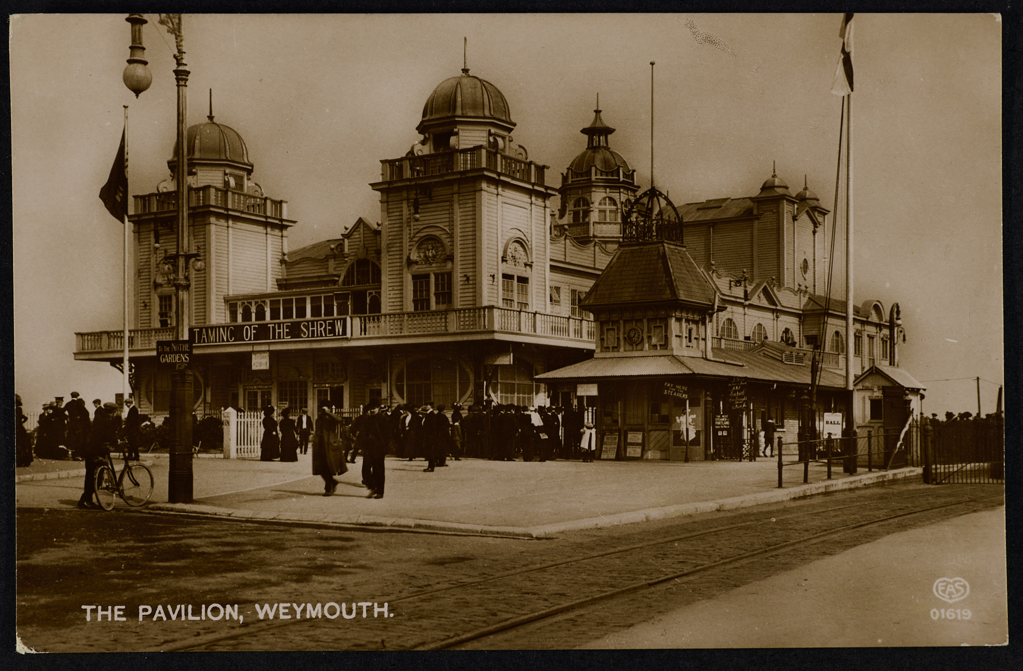 D-DPC/WY/100 – Sent in May 1913, this postcard shows the original Pavilion theatre, which was opened by the Earl of Shaftesbury in December 1908. Hosting live shows and screening films, it was a popular venue in the town in the early 20th century. Later, during WWII, it was used as a headquarters building by the Royal Navy and United States Navy operating from the harbour. It reopened in 1950 as The Ritz but was tragically destroyed by fire in 1954.