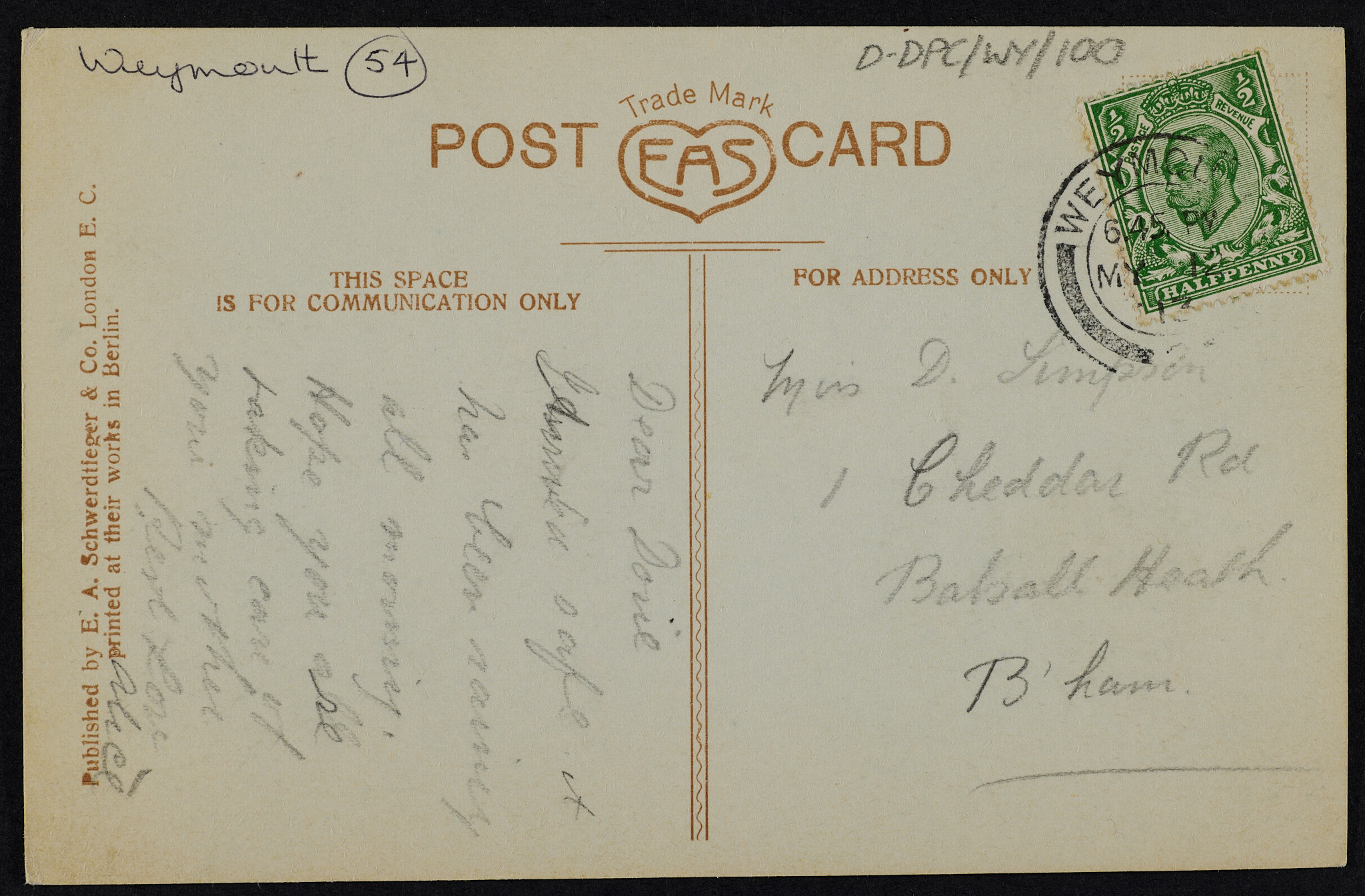 D-DPC/WY/48 – Finally, this postcard shows Weymouth’s floral clock, installed in 1936. It sits in Greenhill Gardens, which were opened in 1872 by Sir Frederic Johnstone, whose family had long represented Weymouth in Parliament. The gardens were presented to the town in 1902.