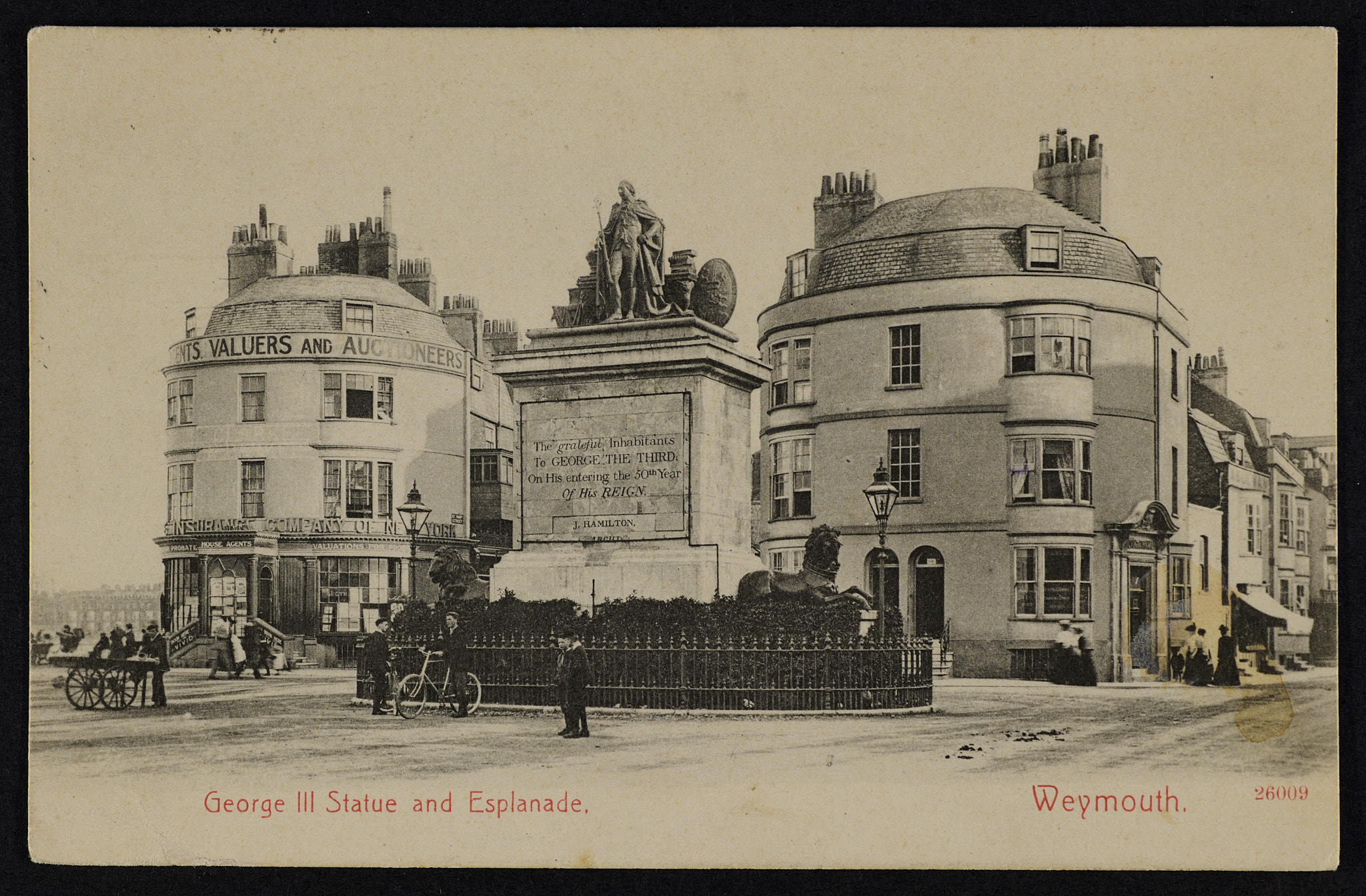 D-DPC/WY/73 – Another recognisable Weymouth monument, the King’s Statue, was unveiled on 25th October 1810. It celebrates the 50th year of the reign of King George III, himself a regular visitor to Weymouth. As can be seen in this postcard, sent in 1905, there was once a large open space in front of the statue where crowds congregated to celebrate special occasions. The traffic islands and gardens that now sit in front of the statue were first laid out in 1955.