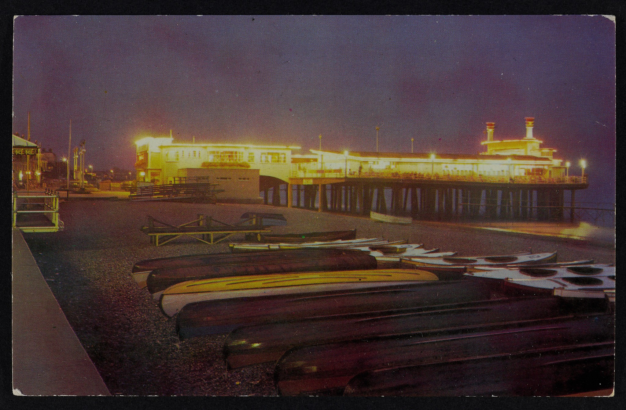 D-DPC/WY/90 – You might have noticed that one of the differences between the two cards above is the Pier Bandstand, visible in the later image but not the earlier one. This controversial structure, shown in this postcard from the early 1970s, was opened in May 1939. It became a popular venue for all manner of entertainments but by the 1980s it had become very costly to repair. It was demolished in 1986.