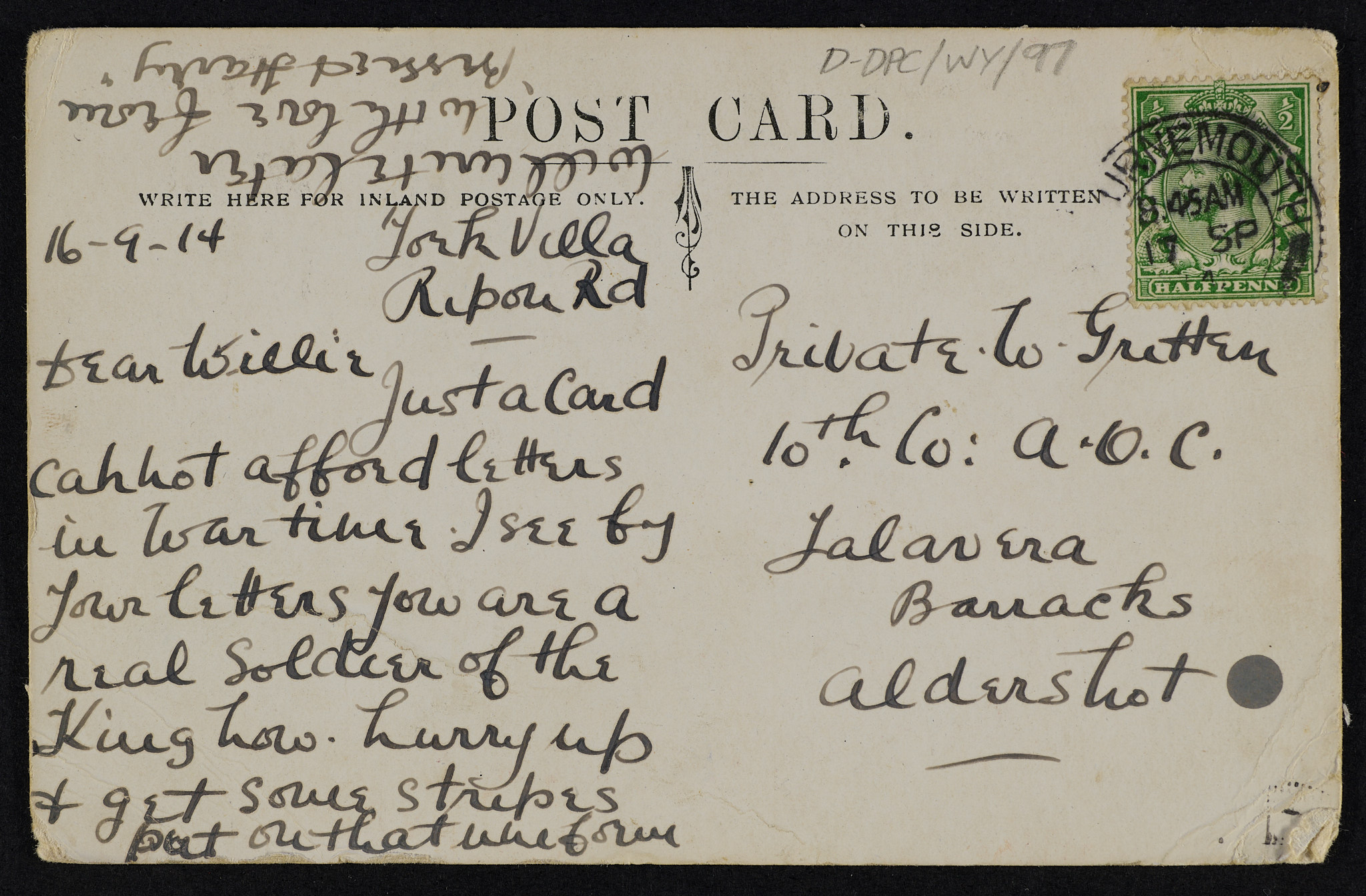 “Dear Willie. Just a card cannot afford letters in war time. I see by your letters you are a real soldier of the King now. Hurry up and get some stripes put on that uniform. Will write later. With love from Bessie and Harry.”