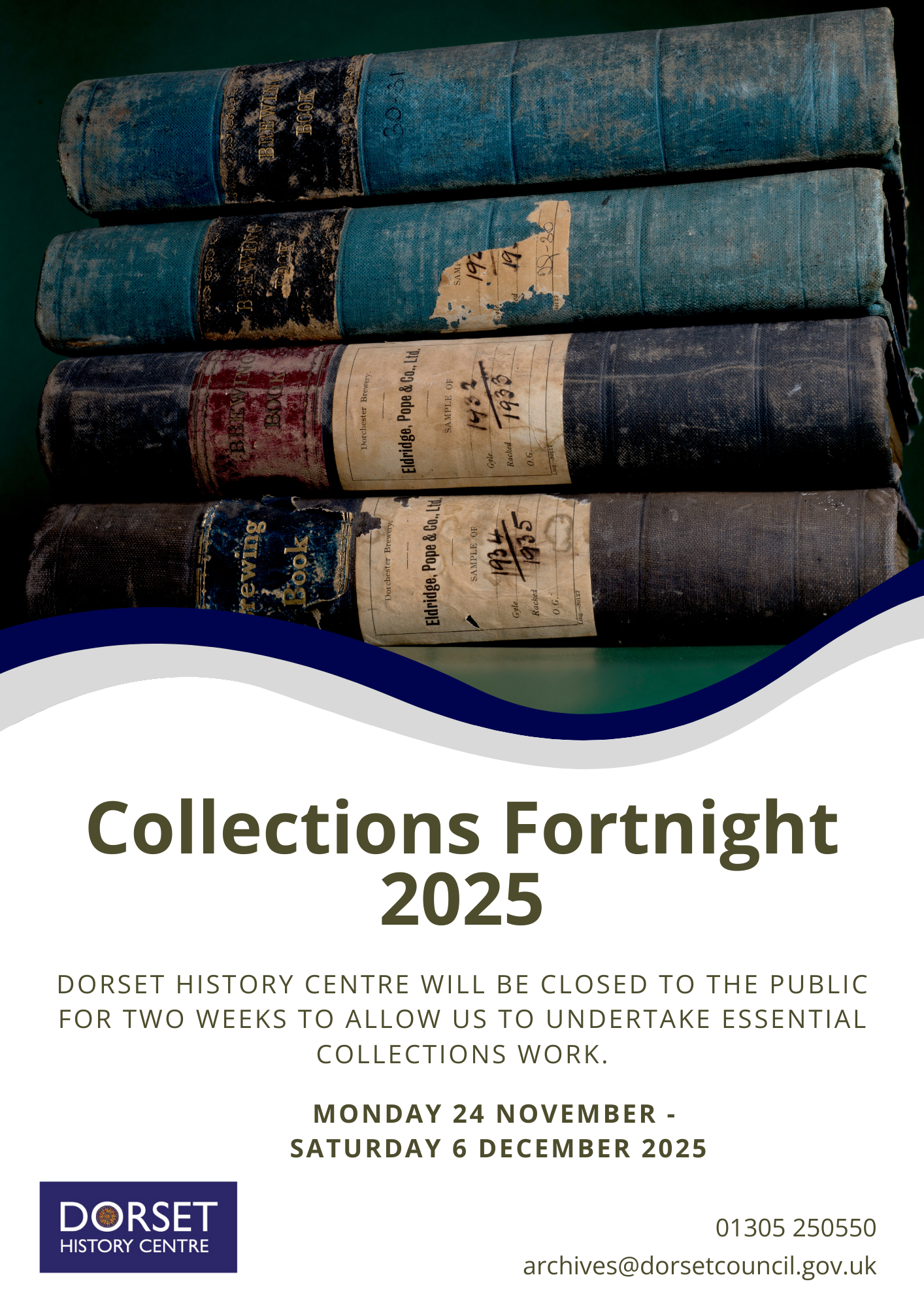 We regret that during this period we will be unable to answer emails or enquiries, or welcome researchers into Dorset History Centre. We will endeavour to answer all enquiries received during this period as quickly as possible from Monday 8 December. We will then reopen to the public on Wednesday 10 December 2025, and will be open on Saturday 13 December (rather than the more usual ‘first Saturday of the month’).