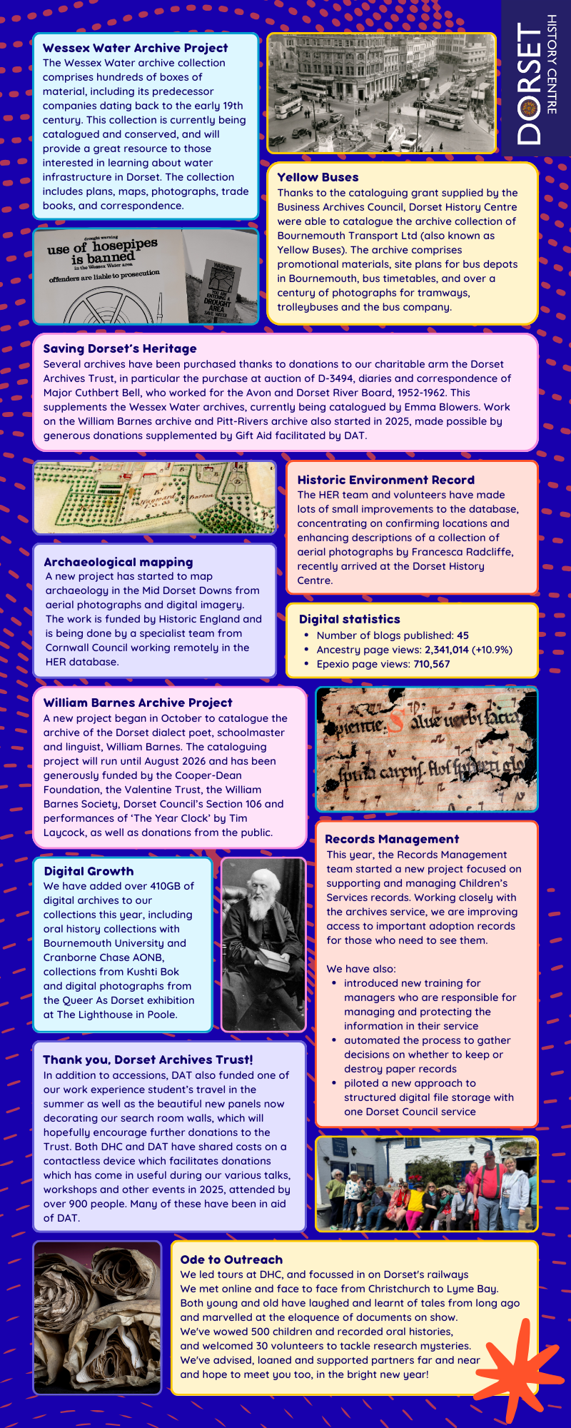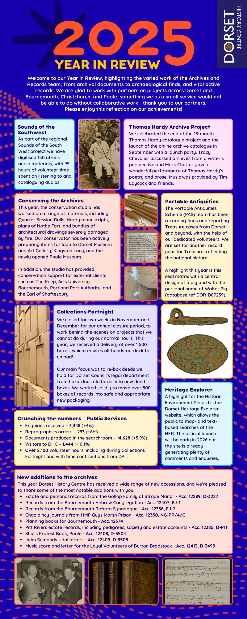 Welcome to our annual Year in Review, highlighting the varied work of the Archives and Records team, from archival documents to archaeological finds, and vital active records. We are glad to work with partners across Dorset and Bournemouth, Christchurch, and Poole; something we as a small service would not be able to do without collaborative work – thank-you to our partners.