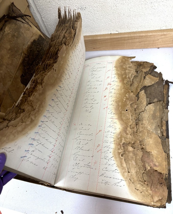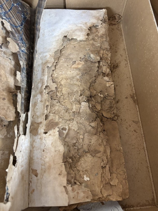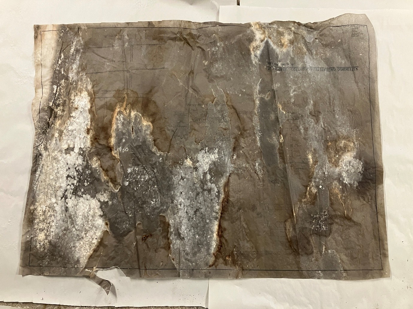 One of the most challenging accessions we’ve seen in recent years arrived after a building fire at the end of 2024. A large collection of architectural plans and documents had survived the blaze and the firefighting efforts, only to be left wet and unprotected for months afterwards.