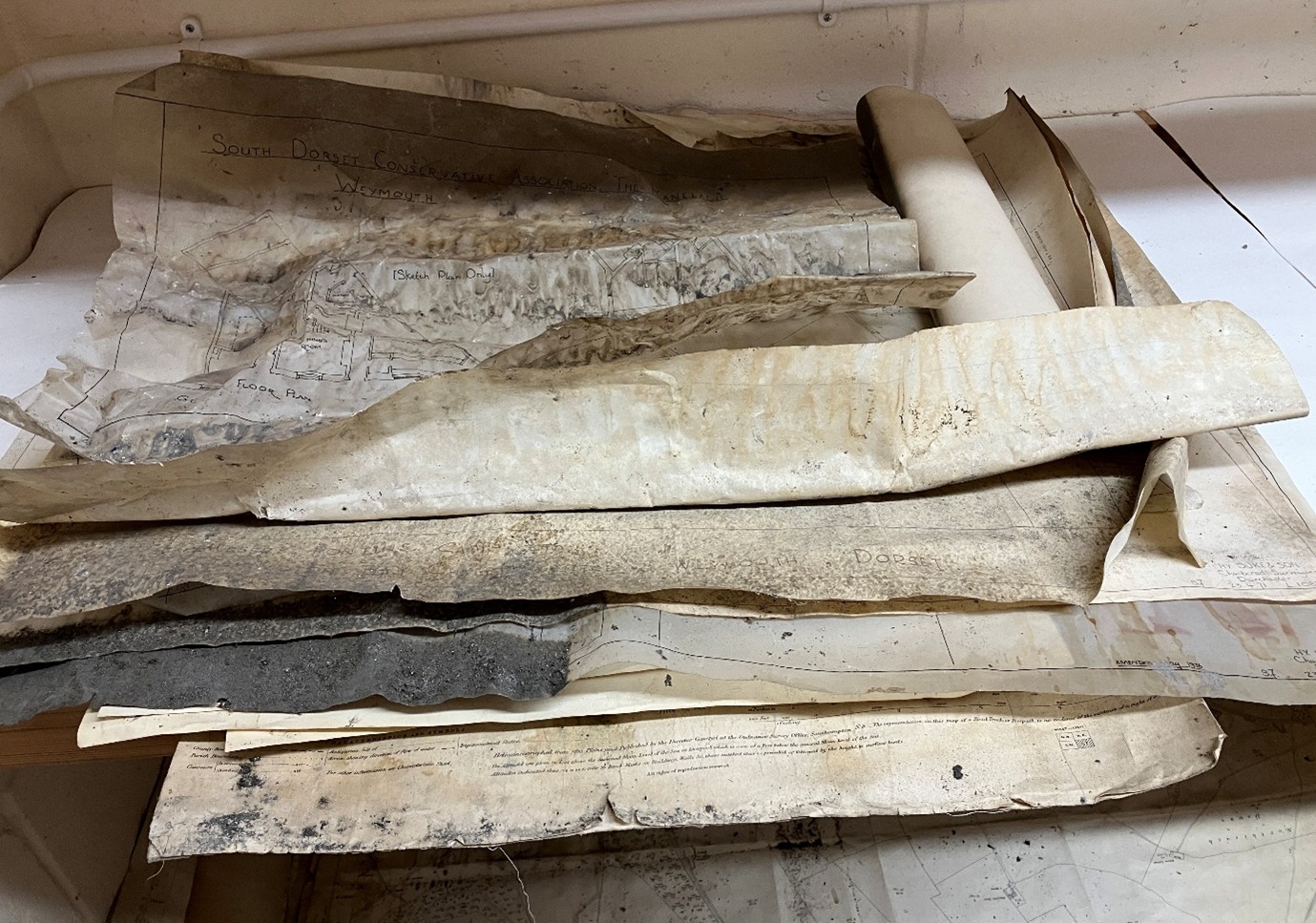 When the material reached us in 2025, it included piles of large maps and plans and six bin bags of documents, all damp and visibly mouldy. Mould attacks the cellulose structure of paper, causing weakness, distortion, staining, and in some cases total loss. Because mould spores spread easily through the air, none of this material could safely enter our repositories.