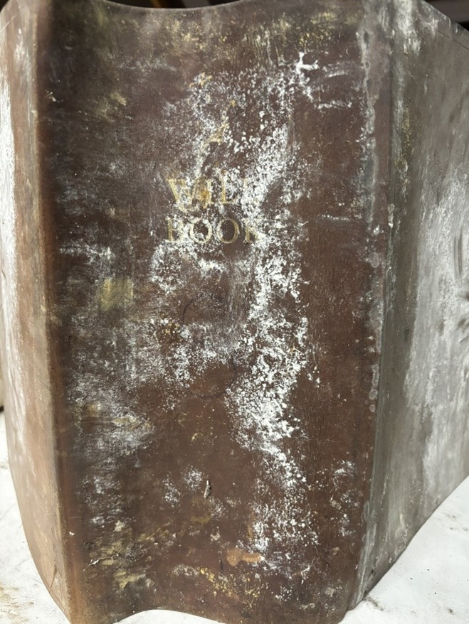 Among them was a particularly large volume heavily affected by mould. It was stood upright on blotting paper with its pages fanned open to dry. Once dry, mould deposits were removed using a soft brush and a conservation vacuum fitted with a HEPA filter. The volume then moved to the conservation studio for further cleaning under fume extraction.